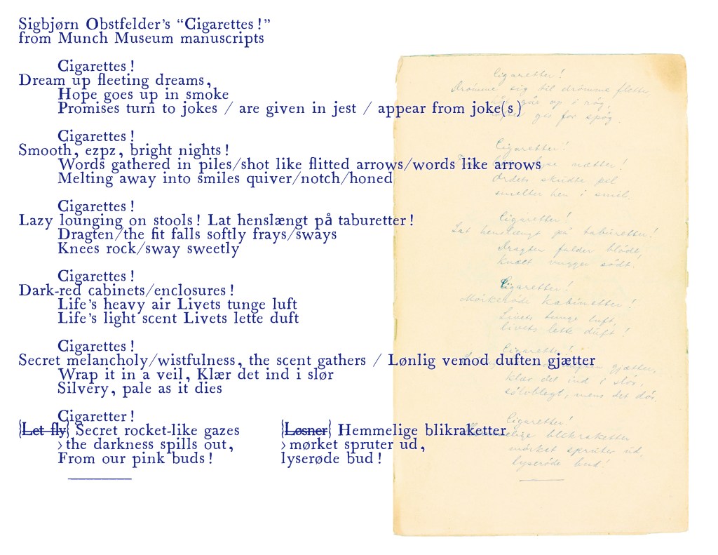 These translations are made from hand-written manuscripts of Sigbjørn Obstfelder’s poetry, which were in Edvard Munch’s possession and are now at the Munch Museum. I spent a summer there, so that I could be close to these pieces of paper. I chose to translate, for you, from the spots in the manuscript that gave me goosebumps.