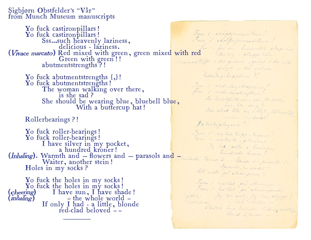 My translation here is done in such a way as to show my process and the nature of the hand-written manuscripts. My own idiolect comes out here in an attempt to match Obstfelder’s excitement with mine. I hope you enjoy these in all their imperfections and immediacies.