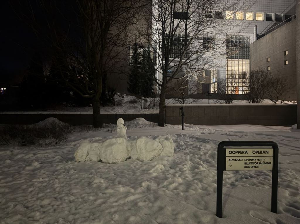 When I arrived at the opera house, the audience (capacity of 1,350) was mostly full, and I heard a healthy mix of Finnish, Swedish, English, and occasionally French being spoken around me. From my seat in the second row, I had an excellent view of the stage, which, at the top of the show, presented a large screen playing flight information for the Bergen airport and various flashing videos alternating between news reports on environmental collapse and advertisements full of corporate lingo about teambuilding, entrepreneurship, and things of that sort.